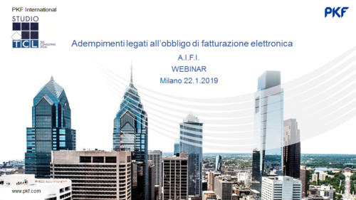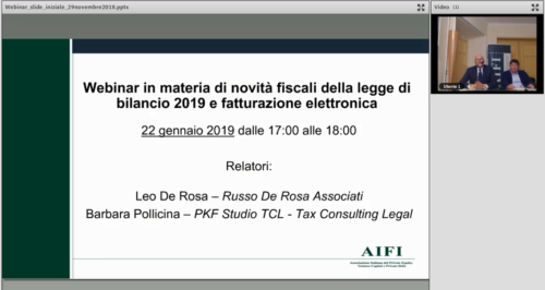 Il Dott. Leo De Rosa, studio Russo De Rosa Associati e la Dott.ssa Barbara Pollicina, PKF Studio TCL, hanno tenuto, in data 22/01/2019, il primo appuntamento Webinar dell’AIFI (Associazione Italiana del Private Equity, Venture Capital e Private Debt) sulle novità fiscali della Legge di Bilancio 2019 e sulla fatturazione elettronica. Potete visionare l’intervento da questo link